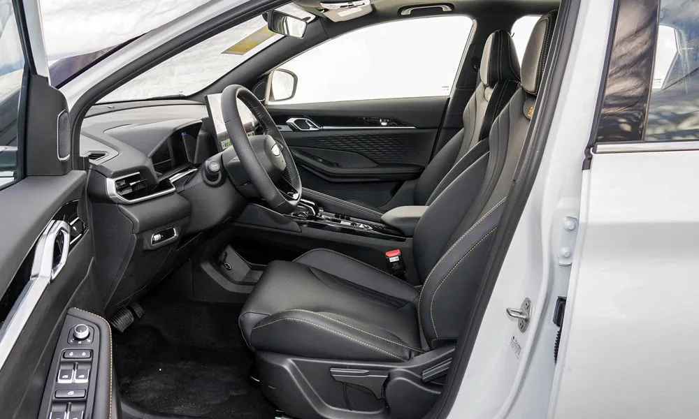 | Отделка интерьера и сидений экокожей чёрного цвета с контрастной строчкой красного цвета |